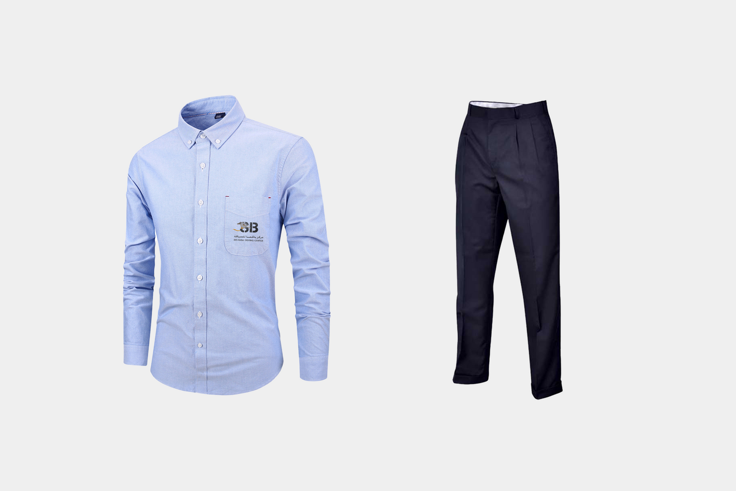 We designed a range of uniforms that seamlessly combined style, functionality, and branding to reflect Saif Belhasa Holding’s commitment to excellence. For Belhasa Car Rental LLC, office staff were outfitted in white and pink Oxford shirts paired with grey polyviscose pants, while drivers wore light blue shirts embroidered with the company’s logo for visibility. At Al Wasel Vehicle Testing Center, technical staff uniforms featured light blue shirts with dark blue panels and matching pants, ensuring both practicality and a unified brand identity.